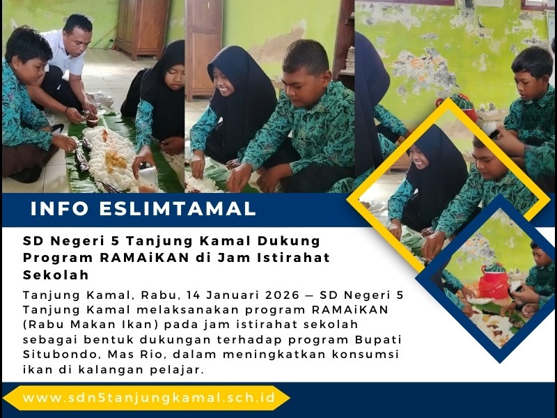 Tanjung Kamal, Rabu, 14 Januari 2025 — SD Negeri 5 Tanjung Kamal melaksanakan program RAMAiKAN (Rabu Makan Ikan) pada jam istirahat sekolah sebagai bentuk dukungan terhadap program Bupati Situbondo, Mas Rio, dalam meningkatkan konsumsi ikan di kalangan pelajar.