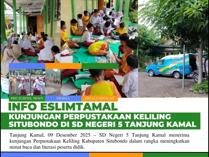 Tanjung Kamal, 09 Desember 2025 — SD Negeri 5 Tanjung Kamal menerima kunjungan Perpustakaan Keliling Kabupaten Situbondo dalam rangka meningkatkan minat baca dan literasi peserta didik. Kegiatan ini disambut dengan antusias oleh seluruh siswa dan guru, terutama peserta didik kelas rendah dan kelas tinggi yang mendapat kesempatan langsung membaca berbagai koleksi buku menarik.