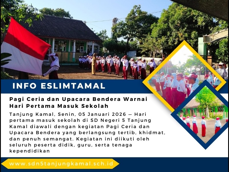 Tanjung Kamal, Senin, 05 Januari 2026 — Hari pertama masuk sekolah di SD Negeri 5 Tanjung Kamal diawali dengan kegiatan Pagi Ceria dan Upacara Bendera yang berlangsung tertib, khidmat, dan penuh semangat. Kegiatan ini diikuti oleh seluruh peserta didik, guru, serta tenaga kependidikan sebagai bentuk penyambutan awal semester sekaligus penanaman nilai kedisiplinan dan kebersamaan.